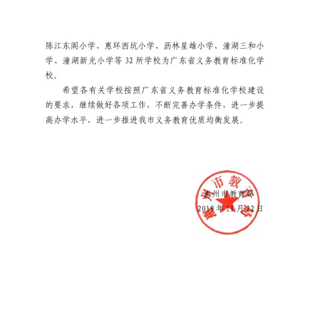 熱烈祝賀惠州一中博羅啟正學校被評為廣東省義務教育標準化學校!